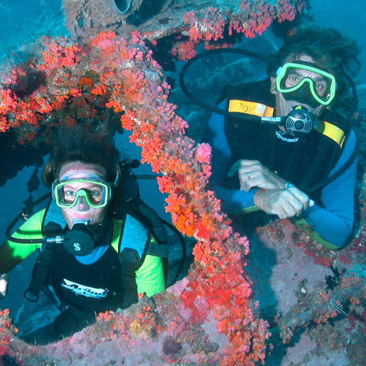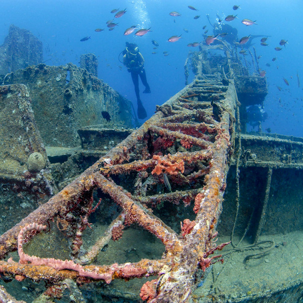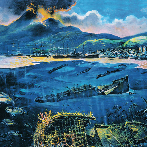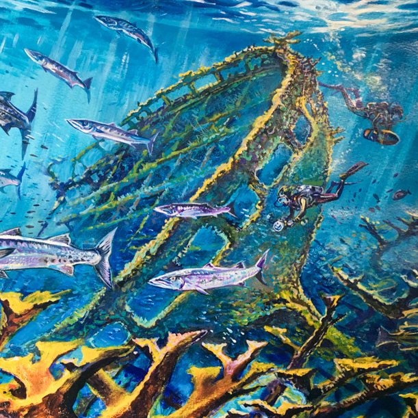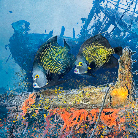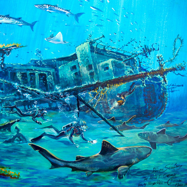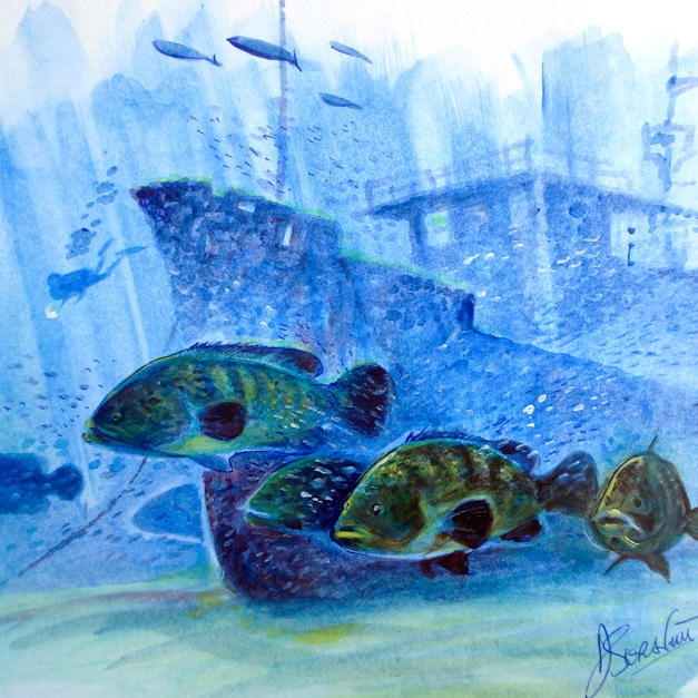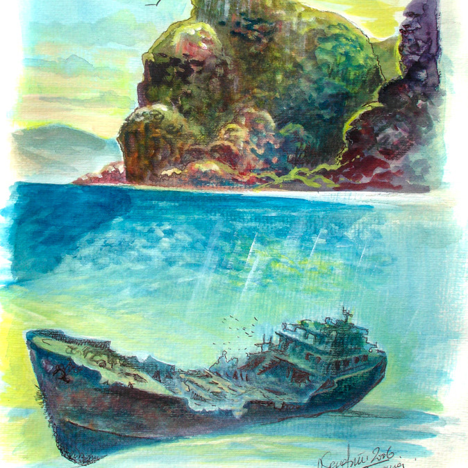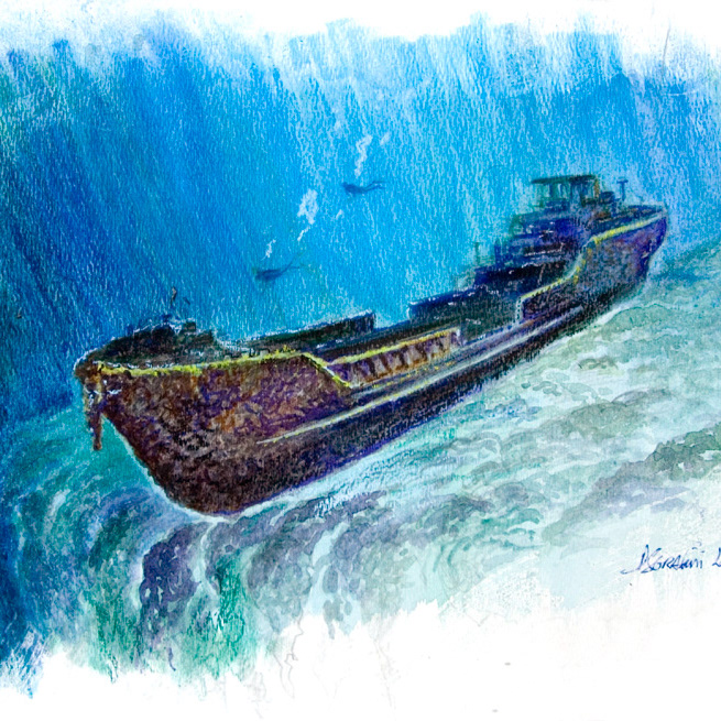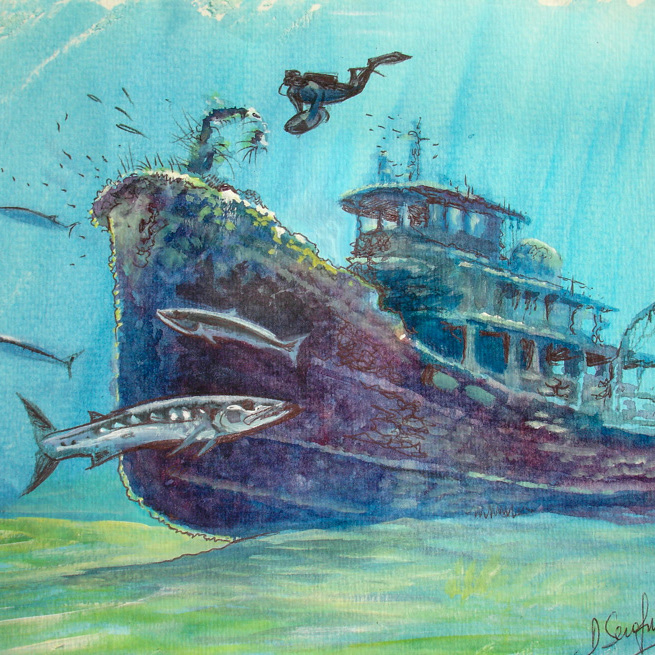 Underwater artists Dominique Serafini and Cathy Salisbury have captured some of the most spectacular shipwrecks of the world. Their paintings, illustrations and photographs tell the stories of these sunken vessels, transformed under the sea into artificial reefs and shelters for marine life. Below are the stories of the wrecks of Aruba, Bonaire and Curaçao, taken from their book about the region. As this website develops, you will see stories of shipwrecks from all across the Caribbean, the Mediterranean and the South Pacific, where Dominique and Cathy have continued their adventures.