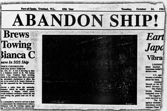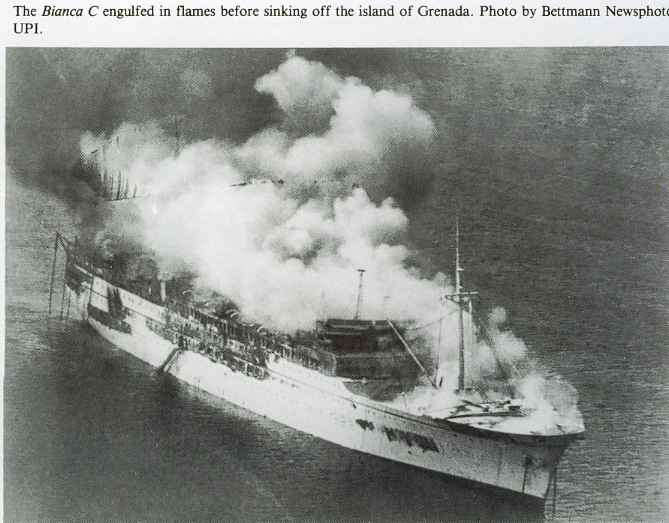 The morning of Octobers 22, 1961, Bianca C, a Costa Line cruise ship, was about to anchor near the town of Saint George in Grenada when there were a series of explosions onboard. The captain quickly disembarked the passengers with the help of local rescue and fishing boats. Thanks to the speed of the maneuver, there were no casualties. The 362 passengers, not really knowing what was going on, found themselves in their pyjamas on the quays of St. George!