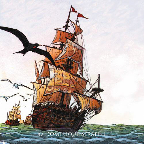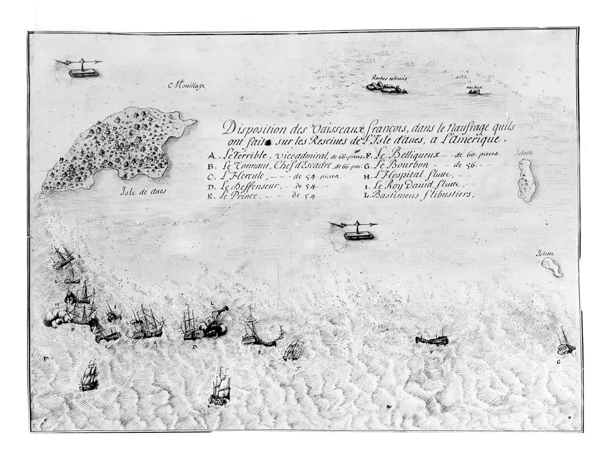 As the French fleet approached Las Aves, d’Estrées’ vigil spotted the lights. Against the advice of his captains and navigators, the Admiral headed his ship—le Terrible—straight for the trap and directly towards the coral reef. By the time the breakers were spotted, it was too late. Le Terrible, too heavy to veer into the wind, couldn’t avoid the reef.